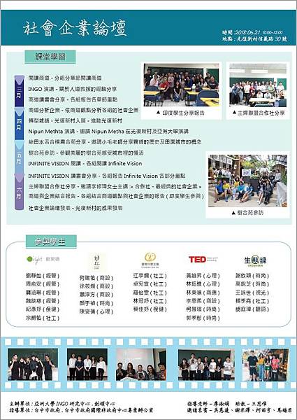 此系列課程自由度極高,除讓學生針對兩本書(商道/Infinite Vision)組織讀書會外,另將學生分組,並讓學生自選臺灣一所社會企業,以「商道」此書所介紹的五種方法自行研讀。經過一學期的探討,同學們於6/21(星期四)上午於INGO中心舉行成果發表。